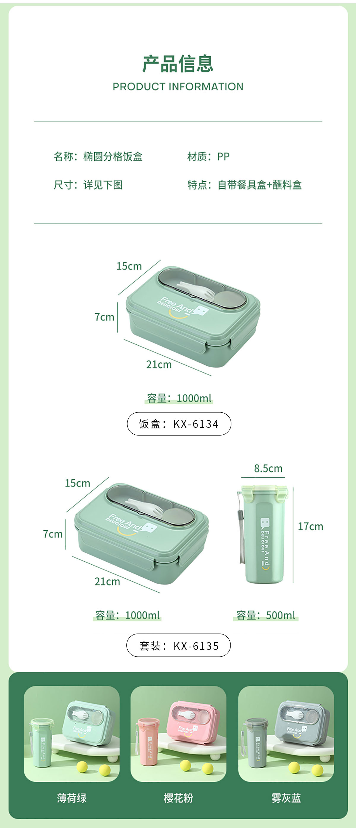 KX-6135:飯盒:210*150*70mm/1000ml 水壺:Φ85*170mm/500ml