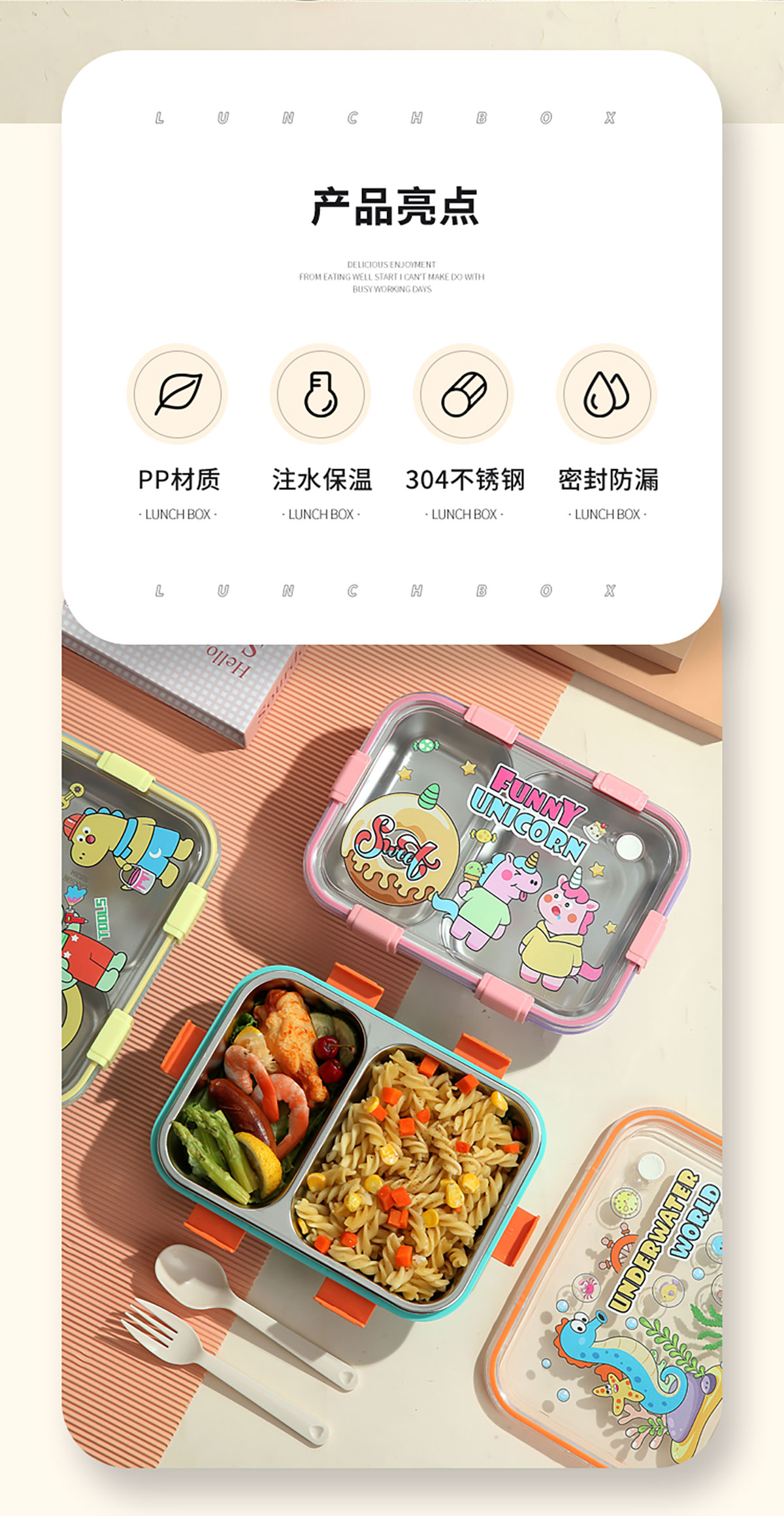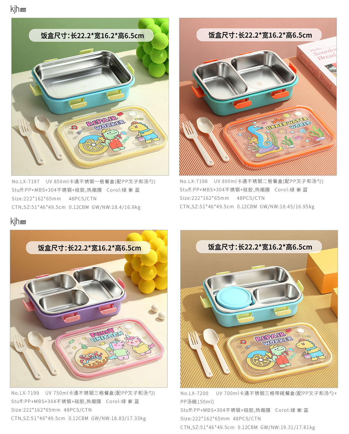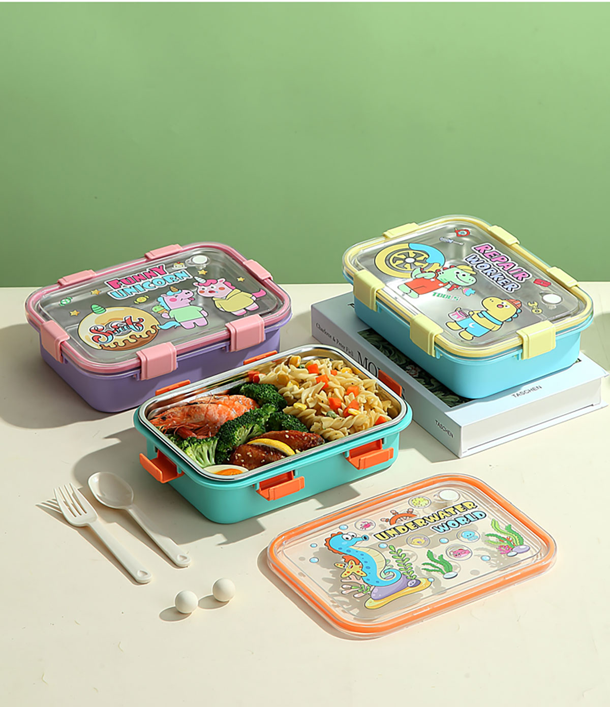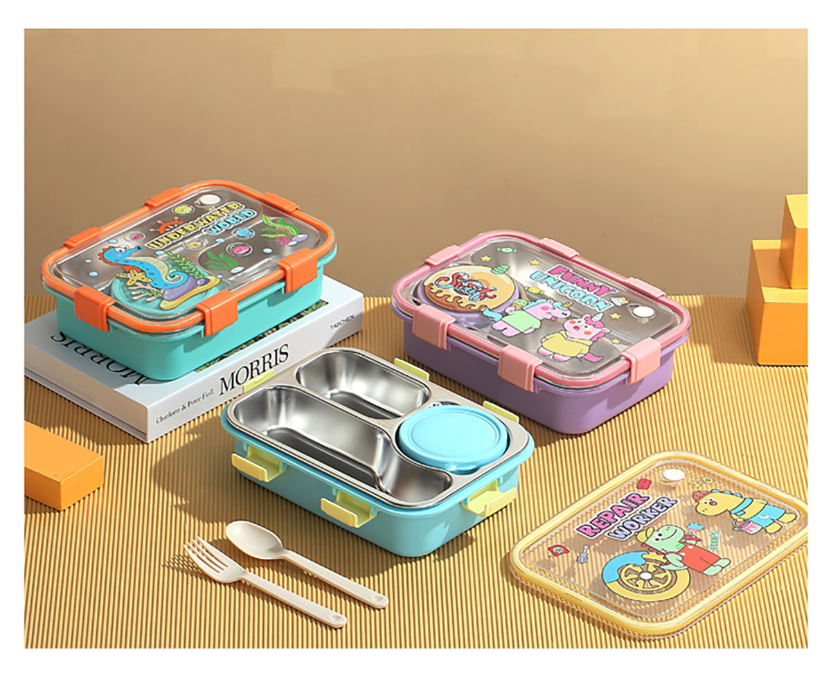 UV 卡通不銹鋼一格/二格/三格/三格帶碗餐盒(配PP叉子和湯勺)