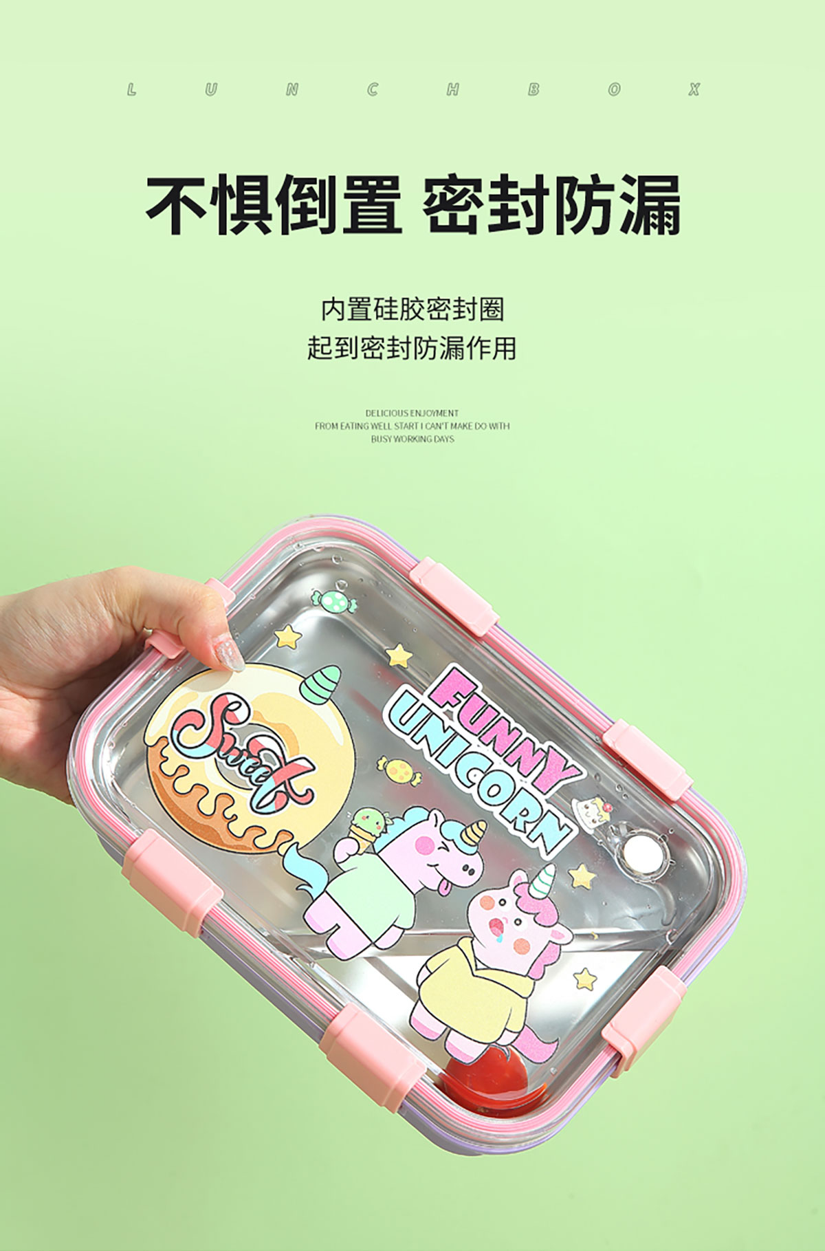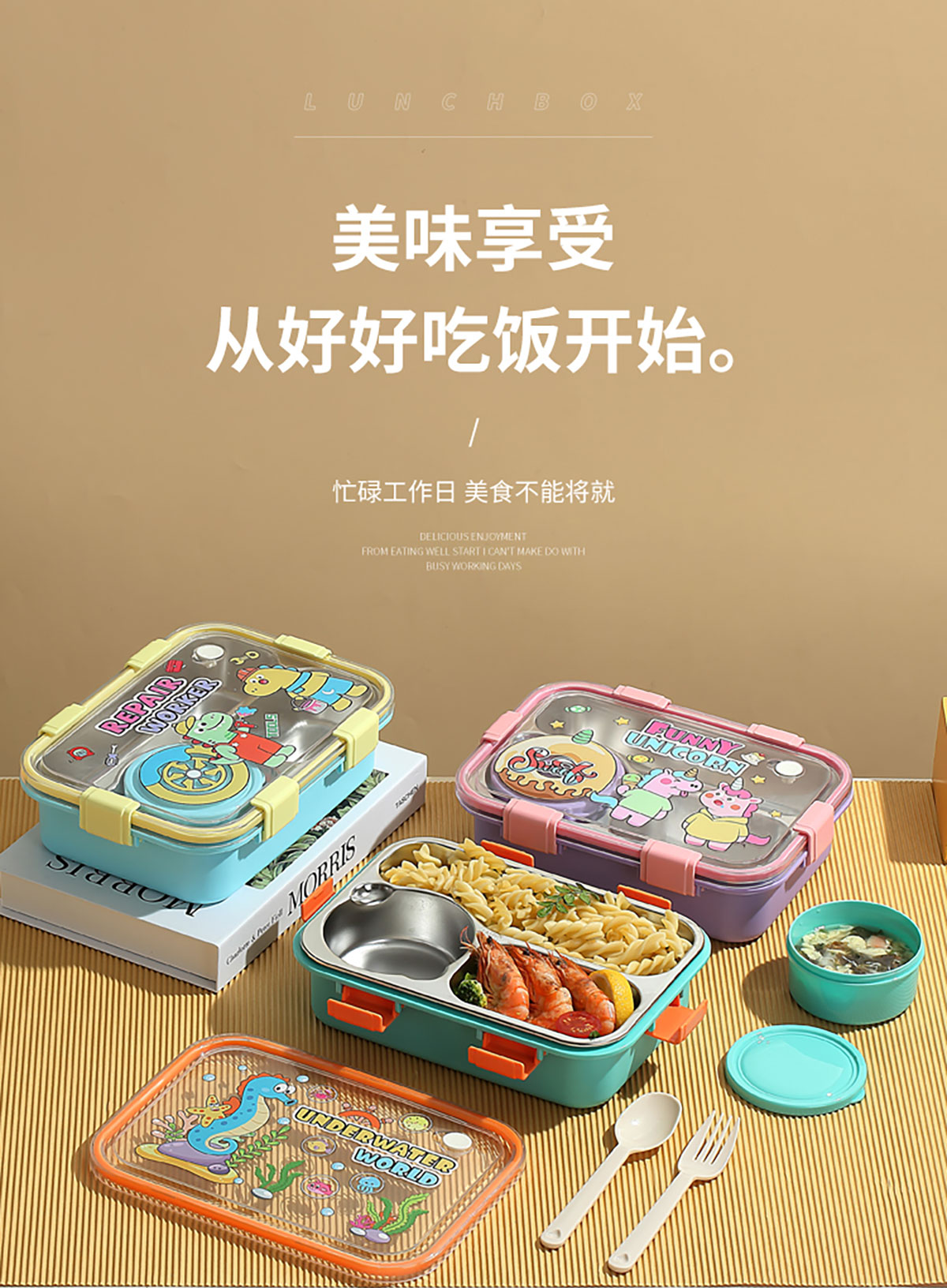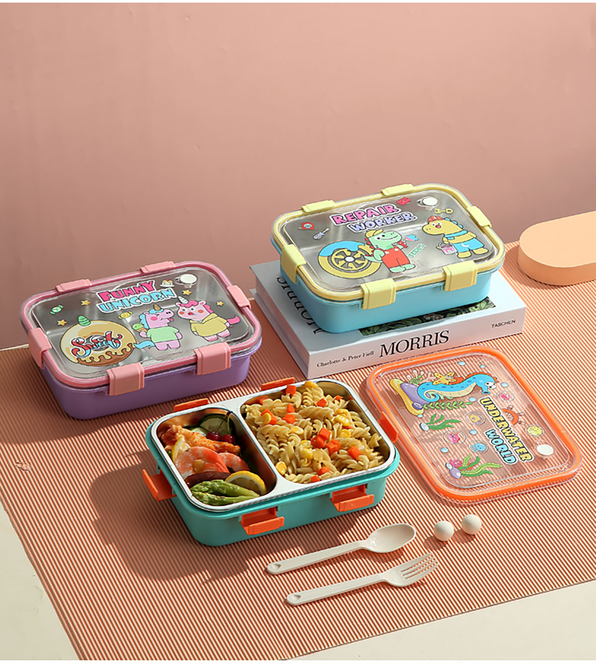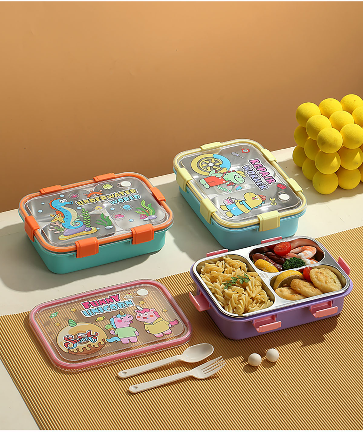 UV 卡通不銹鋼一格/二格/三格/三格帶碗餐盒(配PP叉子和湯勺)